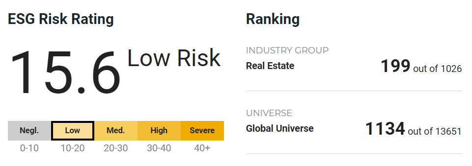 In terms of Sustainalytics rating, CapitaLand has achieved an ESG risk rating of 15.6, which indicates low risk for the company when faced with ESG issues. With this score, CapitaLand ranks 199th out of 1026 companies in the Real Estate Industry Group, which is within the top 20% in the industry group.