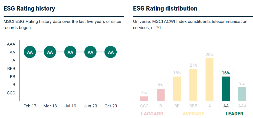 Based on the MSCI ESG Rating, Singtel has maintained a “AA” ESG rating since February 2017. With a “AA” ESG rating, Singtel has been categorised as a leader among 76 companies in the telecommunication services industry.