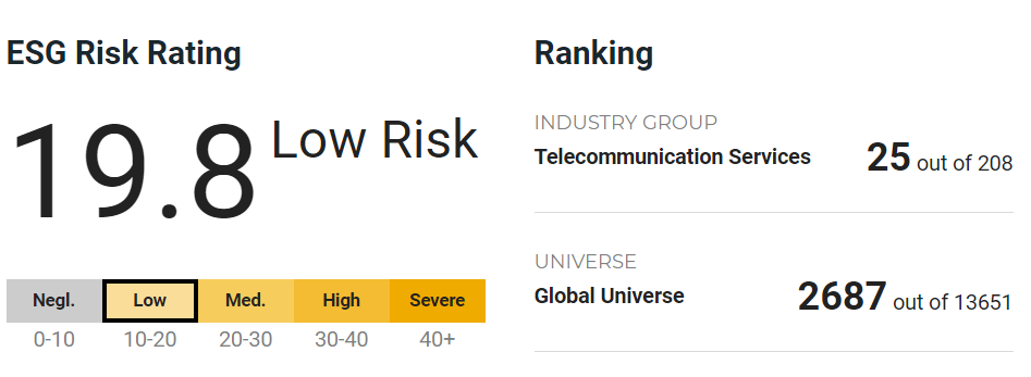 In terms of Sustainalytics rating, Singtel has achieved an ESG risk rating of 19.8, which indicates low risk for the company when faced with ESG issues. With this score, Singtel ranks 25th out of 208 companies in the Telecommunication Services industry, which is within the top 12% in the industry group.