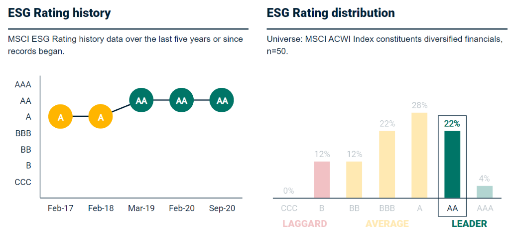 MSCI: MSCI uses a rules-based methodology to identify industry leaders and laggards according to their exposure to ESG risks and how well they manage those risks relative to peers. The scores range from AAA (ESG Leader) to CCC (ESG Laggard).