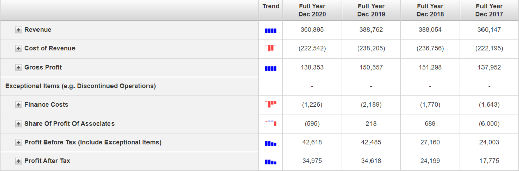 Despite the decline in revenue, Food Empire’s profit after tax (Purple Bar) has registered a growth of 1.0% year-on-year to S$34.97 million in FY2020. This can be attributed to a lower finance cost, selling & marketing expenses and general & administrative expenses.