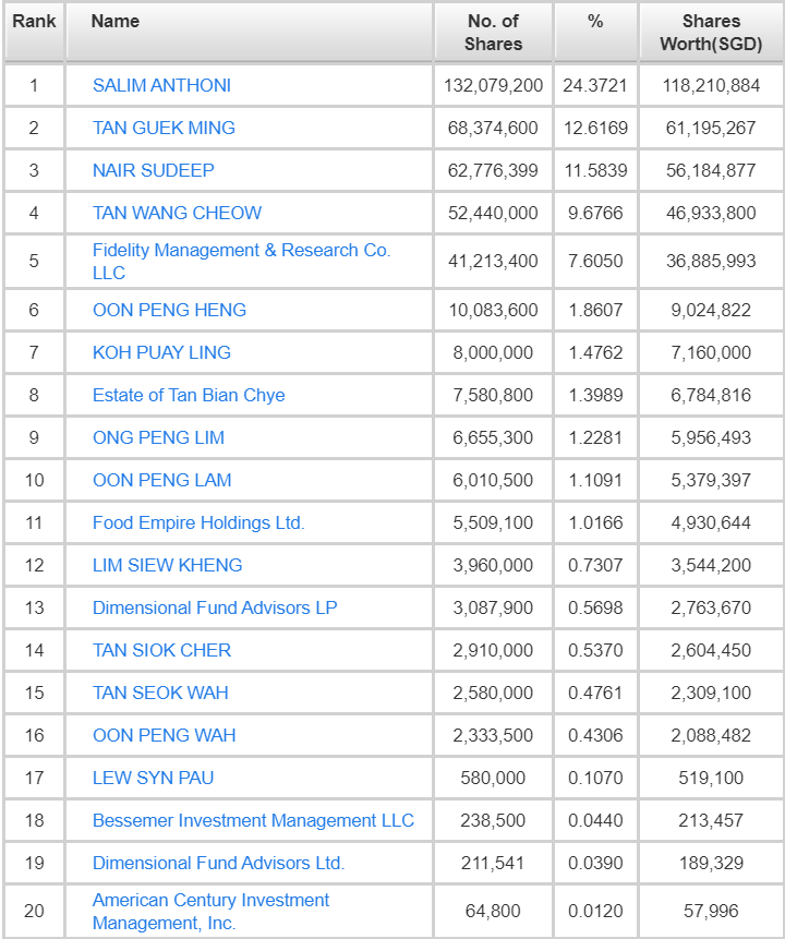 Concurrently, Mdm Tan’s Husband, Mr. Tan Wang Cheow, is the 4th largest shareholder with a 9.67% stake in the Group. He is the founder and Chairman of Food Empire. In total, their combined stake in Food Empire amounts to 22.28%.
