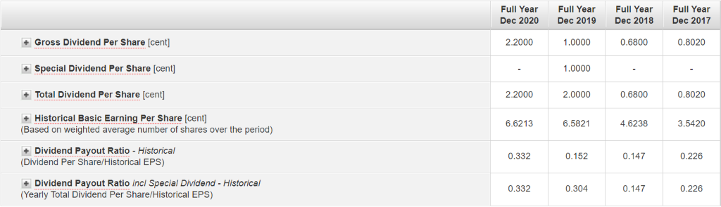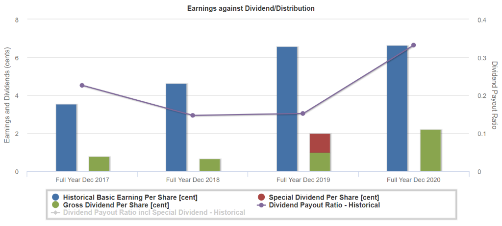 With the improvement in the Group’s profitability, Food Empire’s total dividend per share (Green Bar) got a 10% year-on-year uplift to 2.2 Singapore cents. This resulted in an increase in the dividend payout ratio to 33.2% in FY2020.