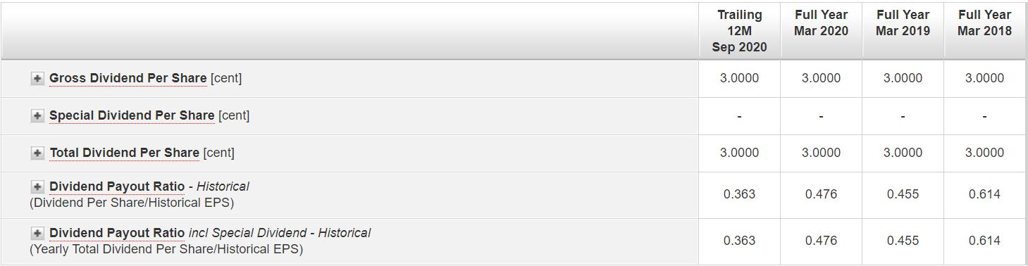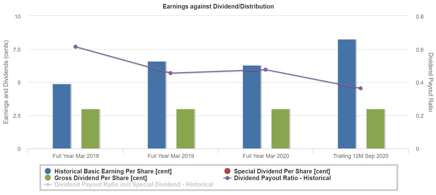 Despite the improvement in the Group’s profitability, Boustead’s total dividend per share of 3 Singapore cents has kept at a similar level for the past 3 financial years. This has resulted in the Group’s dividend payout ratio to dip from a high of 61.4% to 47.6% in FY2020.