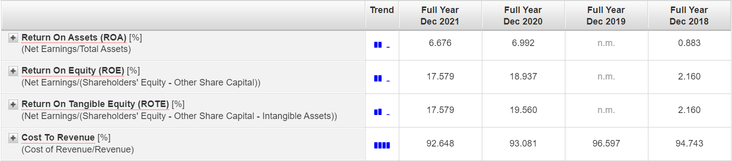 Despite the higher earnings, Broadway Industrial’s Return on Assets (“ROA”) and Return on Equity (“ROE”) saw a slight decline in FY2021 to 6.6% and 17.5% respectively. This decline can be attributed to the significant increase in the amount of shareholders’ equity.