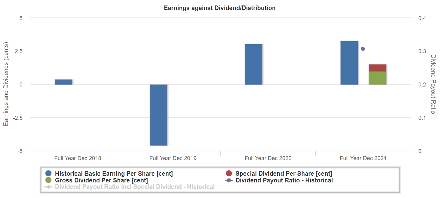 Without a dividend payout in the past few years, Broadway Industrial finally dished out a total dividend per share of 1.5 Singapore cents in FY2021. This translates into a dividend payout ratio of 45.8% (including special dividend).