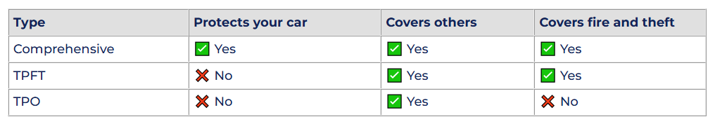 This is a step up from TPO. It includes the same third-party cover but also protects your car if it’s stolen or damaged by fire. It’s a good middle-ground option if you want extra peace of mind without paying for full comprehensive cover.