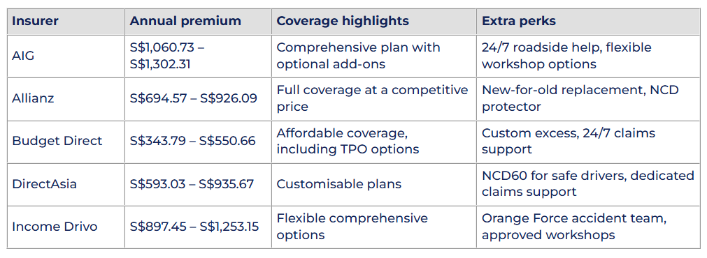 This is the basic level of insurance required by law in Singapore. It only covers damage you cause to other people’s vehicles or property. It won’t cover your own car. This is usually the cheapest option and may work for older cars with low resale value.