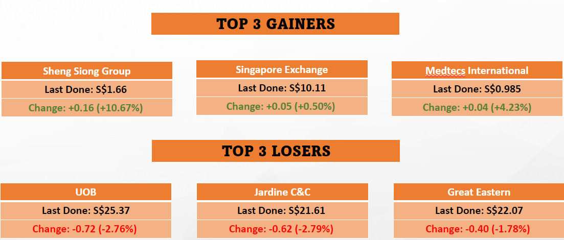 On the other hand, supermarket operator Sheng Siong surged 10.66% to a new recent high at S$1.66 as queues built up at supermarkets. Keppel DC was also up, gaining 0.78% to S$2.58.