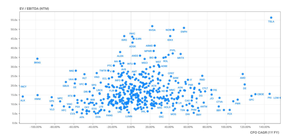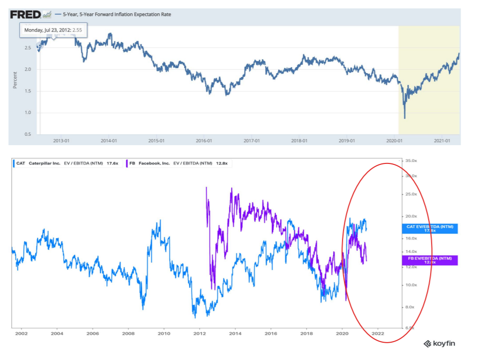 Rally in industrials has led to valuations pricing in a significant earnings recovery, whereas growth (that also benefits from a recovery) has seen valuation compress - see CAT vs. FB NTM EV/EBITDA below. Unless inflation resets at a meaningfully higher base level, hard to justify decade high valuation multiples for industrials.