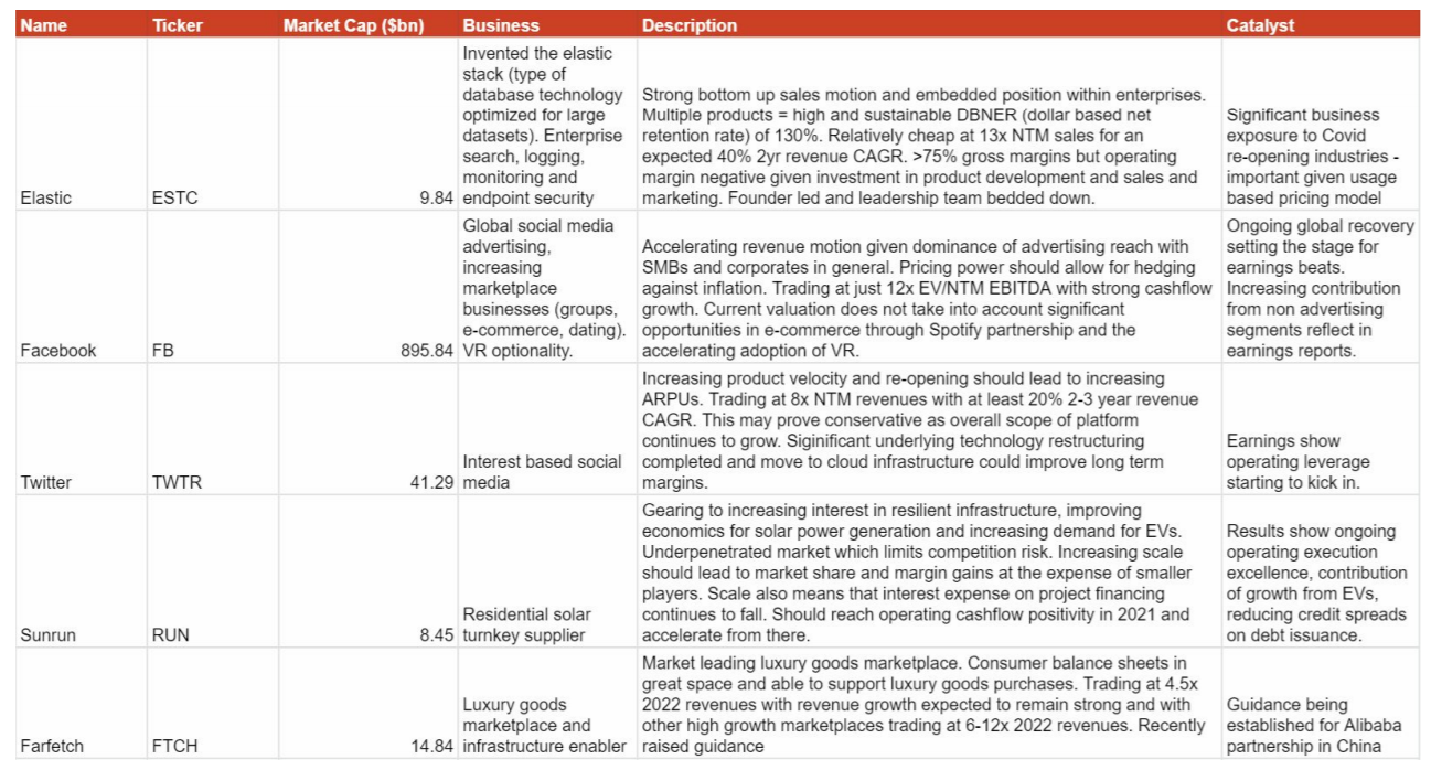 Need to be discerning, especially around valuations and positioning for single stocks. Within tech, preference for platforms leveraged to re-opening and horizontal software infrastructure providers leveraged to an increase in technology capex budgets. I use my personal experience in this sector as an operator to understand complexity to beat consensus.
