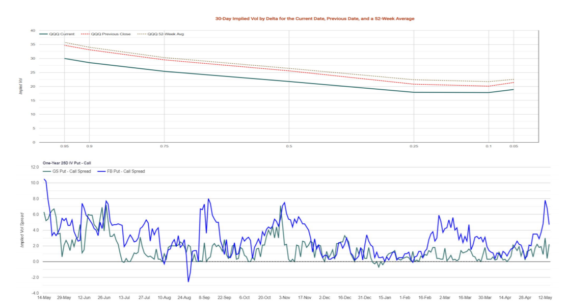 Interestingly, IV for deep OTM QQQ call options is lower relative to 52 weeks average indicating less bullish views being expressed through options for capital efficiency. Flatter and lower skew is typically a more bullish signal (better positioning).