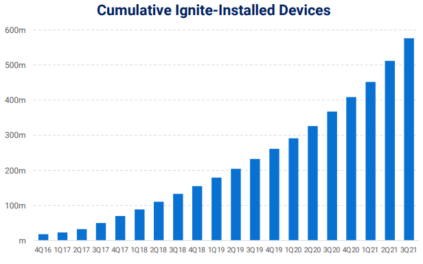 Numbers have been impressive. Although the company’s comprehensive “Ignite” programming has been installed on nearly 600 million devices worldwide (see below), it still has under 20% of the total global Android smartphone market – Ignite is not yet available on Apple iOS devices.