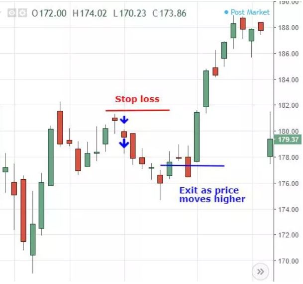 When seeing such a pattern, consider initiating a short trade near the close of the down day following the hanging man. A more aggressive strategy is to take a trade near the closing price of the hanging man or near the open of the next candle. Place a stop-loss order above the high of the hanging man candle. The following chart shows the possible entries, as well as the stop-loss location.