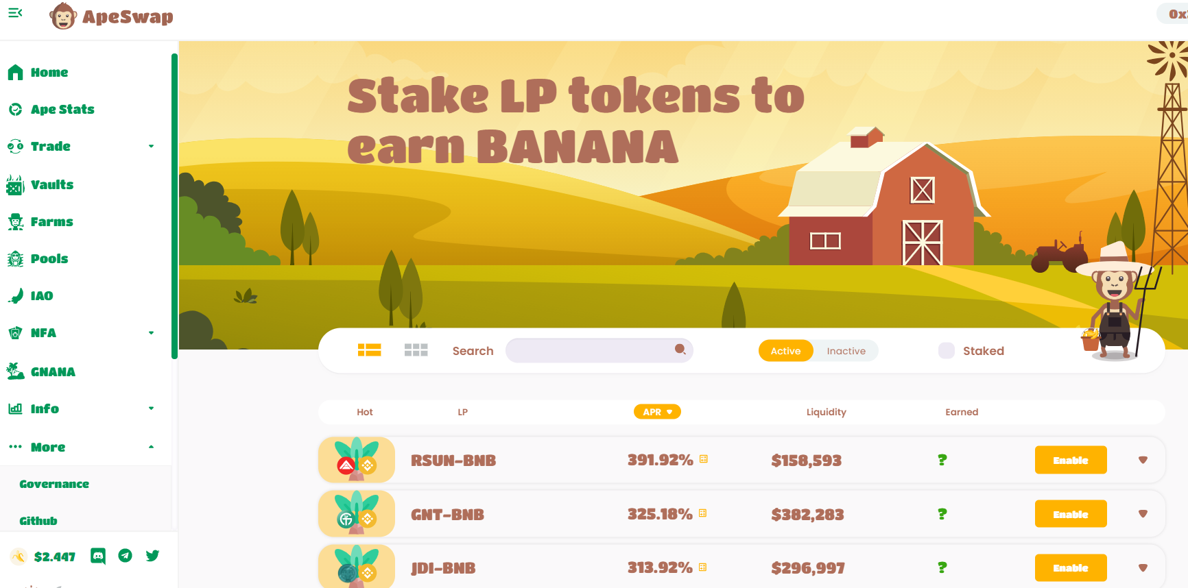 $BANANA is the native currency of the ApeSwap platform and users can stake, farm and pool their tokens to earn more $BANANA with insane APYs of up to 390%! (As of 22/09/2021, 6:29PM SGT)