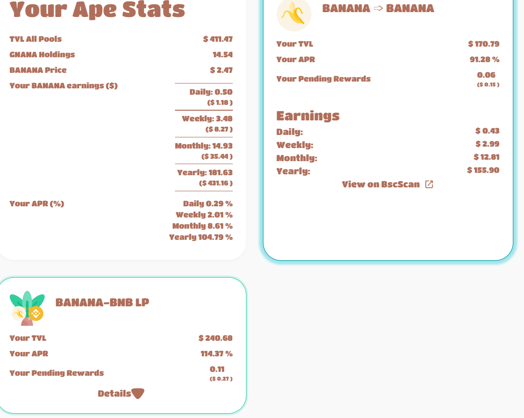 I left my $BANANA alone and forgot about it, until I checked back 3 weeks ago and realised that I managed to farm 52 $BANANA, which at that point of time was worth $3, making me more than $150 just over 4 months, with only $600 invested!