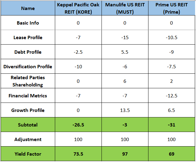 I have termed the score as a "yield factor" because that is how I would use it for fundamental intrinsic value in the later part. A 100% yield factor means I would accept the REIT with its sector benchmark dividend yield. For example, if I set office sector REIT benchmark yield as 6.5%, then I would require the min. dividend yield to be benchmark yield x yield factor: