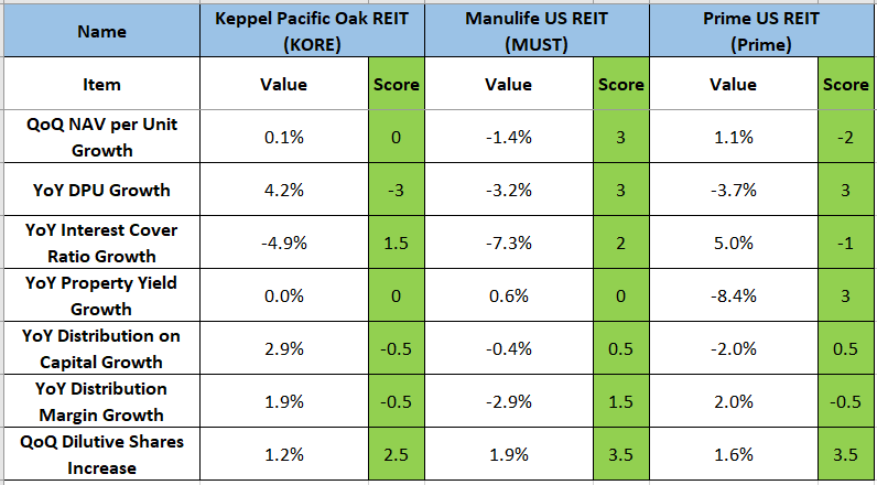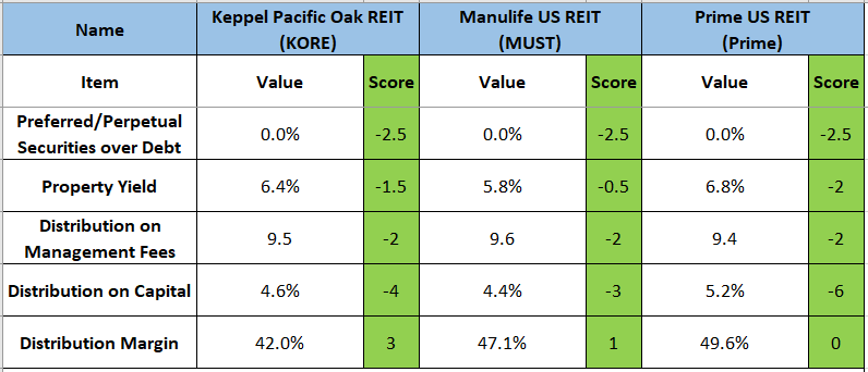 As all the 3 are REIT and semi-annual distribution, their scores are as below: