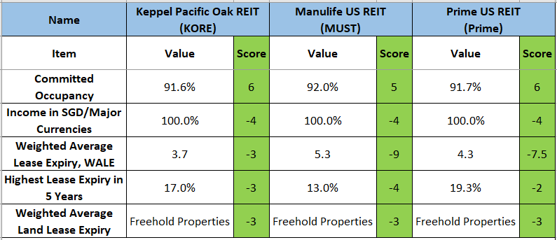 So, how do I conduct a fundamental analysis? Well, a scorecard is my way to do it. Old school? Yes, it is old school. Not workable for the qualitative parts? Agree, that is why it is important to quantify as many "qualitative" parts as possible. I've always believed that good qualitative aspects would be reflected in quantitative aspects. I have previously shared this idea in 2019 in Quantifying REITs Fundamental post, where a lower score indicates favorable/lower risk and vice versa. This time, I would pick the 3 U.S. Office REITs as a case study and go through it steps by step, as detail as possible.