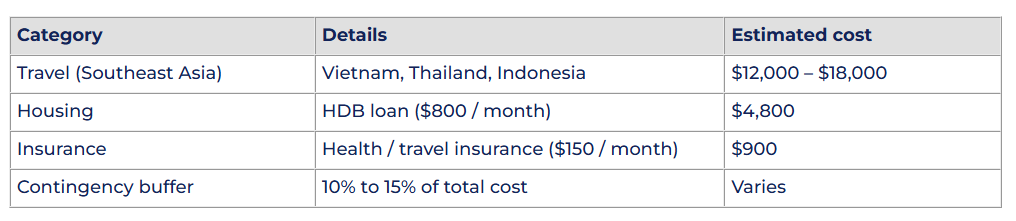 The example focuses on travel within Southeast Asia and includes general living expenses. However, it can be adapted to suit different destinations, lifestyles, or goals. Use this breakdown as a guide and adjust the categories and amounts based on your personal plans and financial responsibilities.
