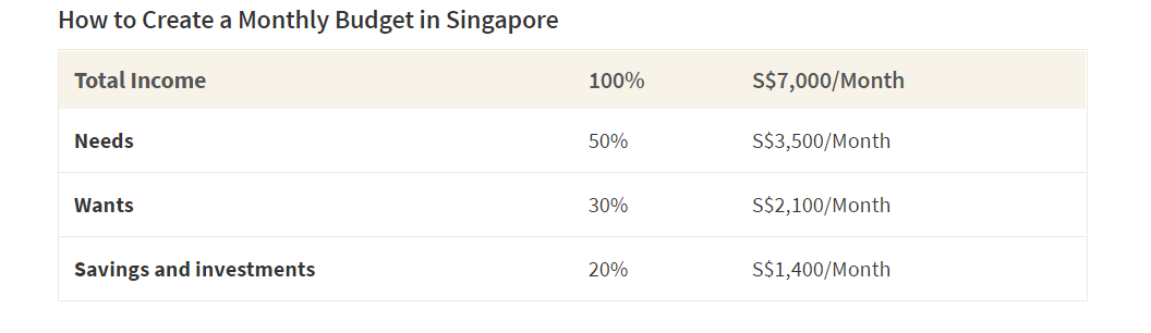 For example, if you and your spouse earn a combined income of S$7,000/month (after all taxes and deductions), then according to the 50-30-20 rule, here is how you would create a monthly budget: