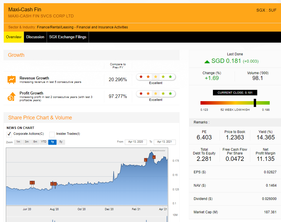 You could use dividends as a deciding factor when choosing stocks, because they indicate that the company is profitable and that there is a good possibility of future earnings. The highest dividend yield portion under the performance section will allow you to monitor highest dividend yield companies! We are keeping an eye on Maxi-Cash Fin as it is a higher dividend yield stock with excellent revenue and profit growth.