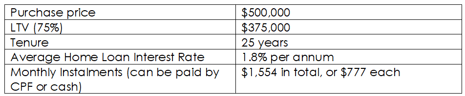 For a typical home purchase at $500,000, the couple would need to pay monthly instalments of $1,554 (or $777 each), assuming the couple applied for a loan from a private bank instead of a HDB loan. Now, Alice can choose whether she wishes to pay her monthly instalments solely from her CPF or with a mixture of cash and CPF.