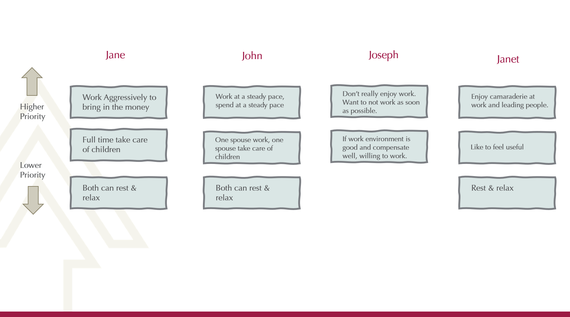 Each of these ladies and gentlemen rank their life priorities uniquely.