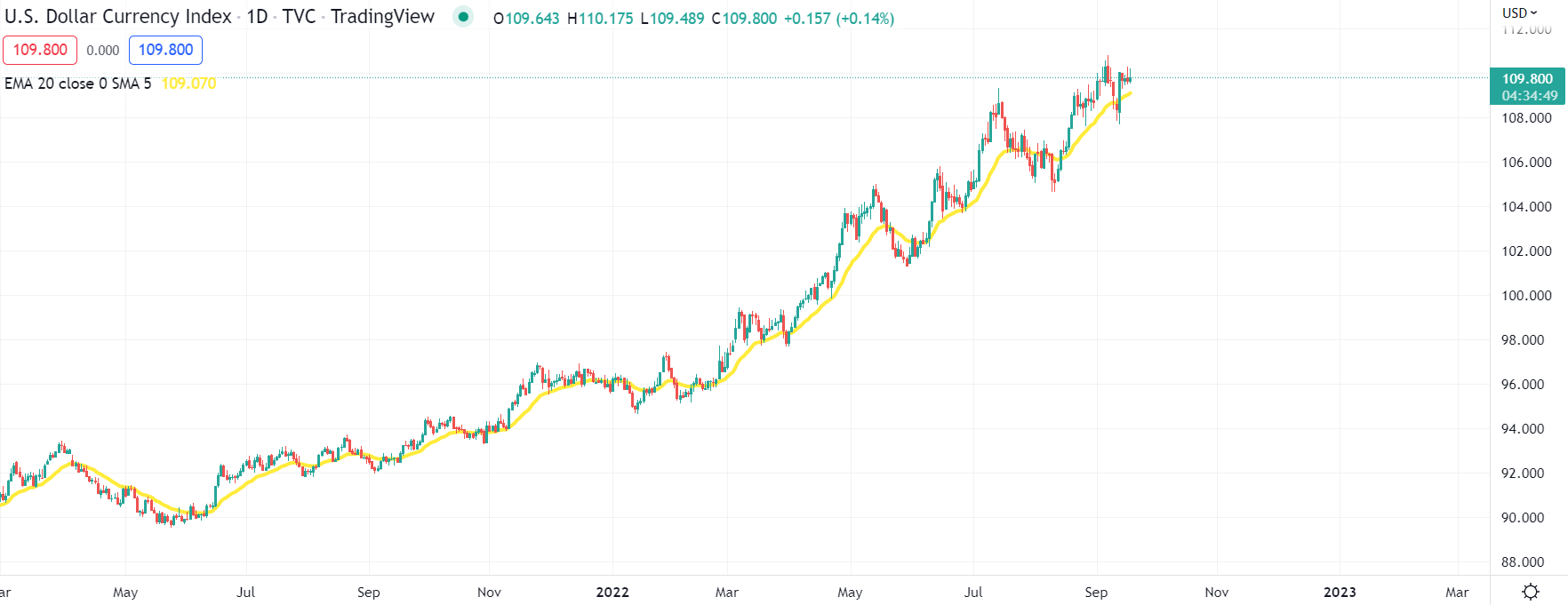At the time of writing on 19 September, the US Dollar Index which measures the strength of the United States Dollar stands at $109.80, the highest since 2002.