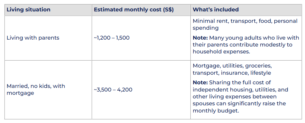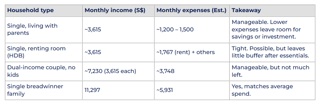 Note: Income data is from the Singapore Department of Statistics (2024) and HDB Rental Flat Market (2024). Actual figures may vary depending on lifestyle and location.