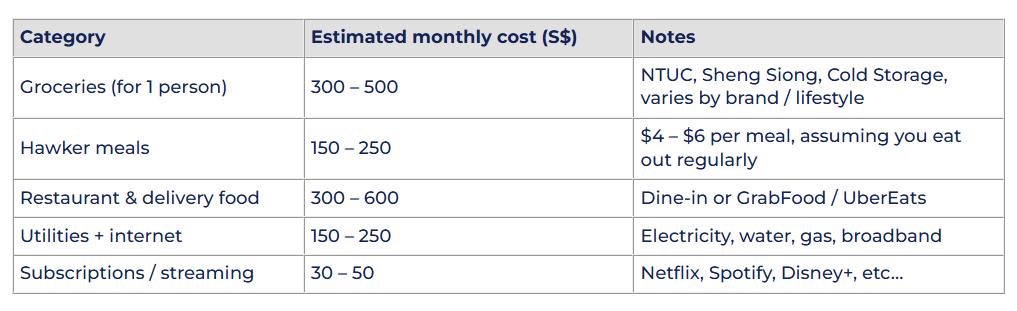 Groceries, hawker meals, electricity, water, and internet may seem manageable individually, but they add up quickly.