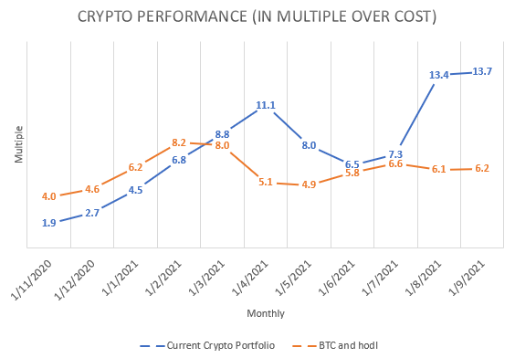 The last time I added actual SGD from my income into crypto was in July 2020. Hence, my starting point for comparison to be conservative will be the start of 2020. The current chart shows the comparison from Nov 2020 as I've only begun to measure my performance then. I've also included an index to track (assuming if I invested all my cost into BTC and hodl) my active investing performance in crypto.