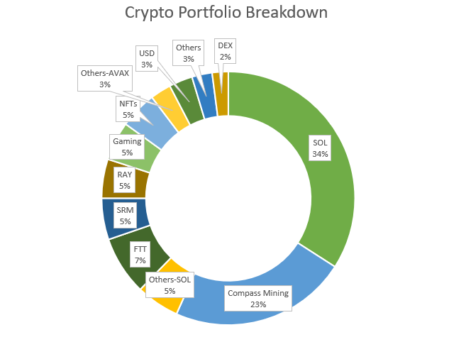 My largest holding is Solana, then some bitcoin miners (Compass Mining), then other components of the Solana ecosystem (SRM, RAY). FTT is also a blue-chip exchange token, which I urge interested investors to take a look at. It's quite a virtual cycle, especially given its association with the Solana ecosystem.