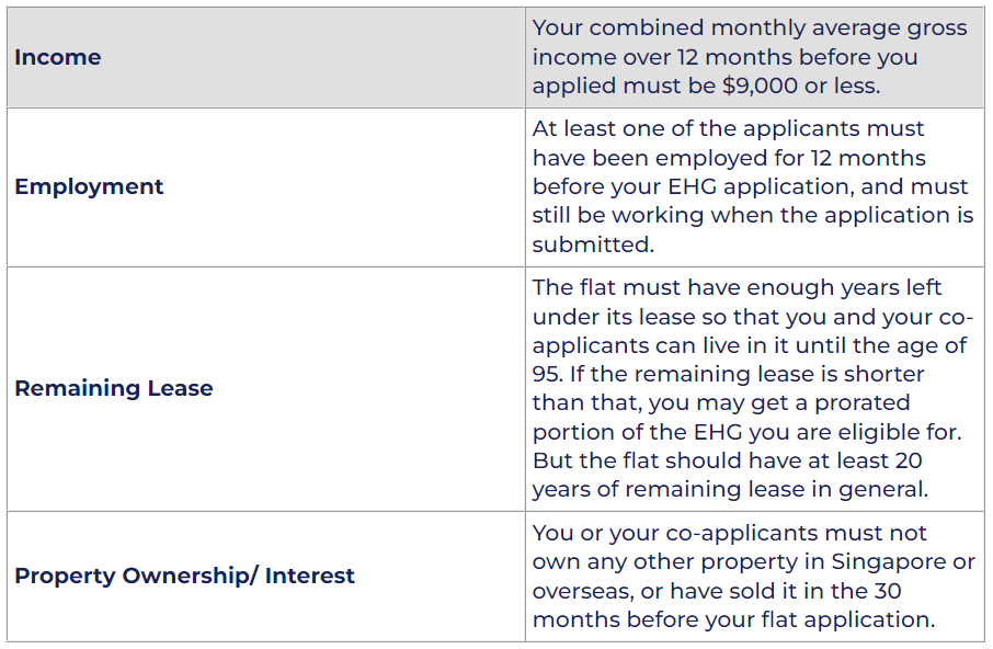 For whichever scheme you’re thinking of applying, you can download and fill out the EHG application form and submit it with the necessary income documents to HDB at your booking appointment.