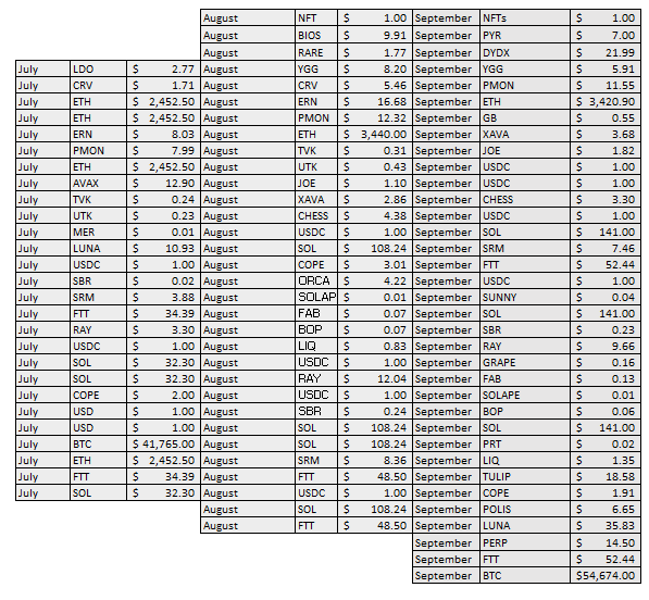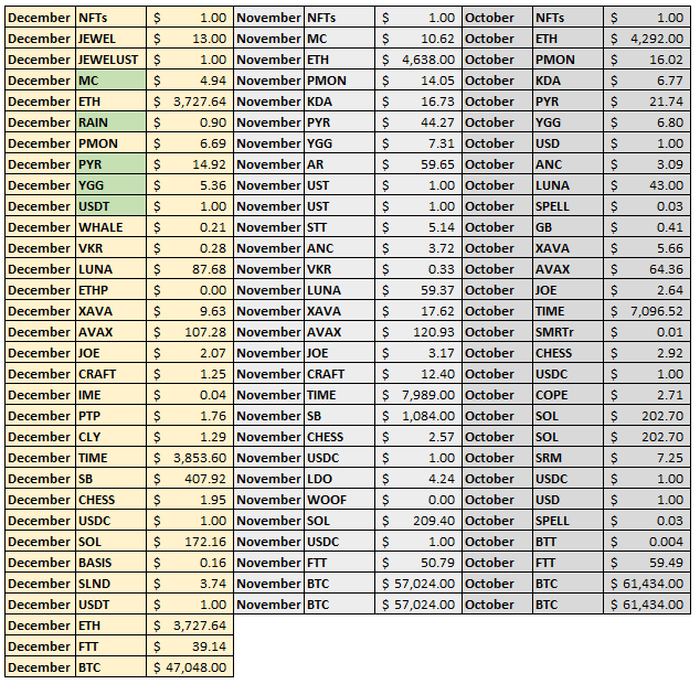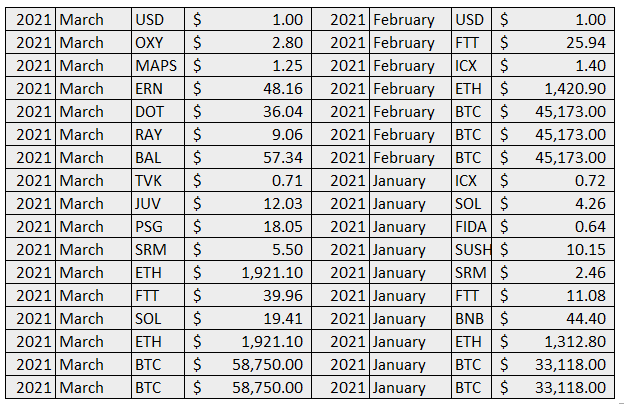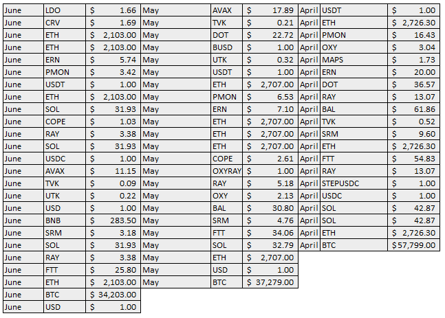 Prices here refer to marked prices as of end of month. Labels like OXYRAY and STEPUSDC refer to liquidity pool (LP) tokens. They have a price of $1 as I’m treating them as USD. For example, if I have $2000 worth of LP tokens in OXYRAY, that will be 2000 units of OXYRAY (I’ve marked the value as $1). It’s easier to track this way.
