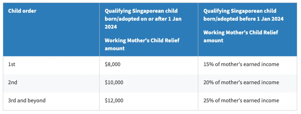 For Singaporean children born or adopted before 1 January 2024, the tax relief is based on a percentage of the mother’s earned income: