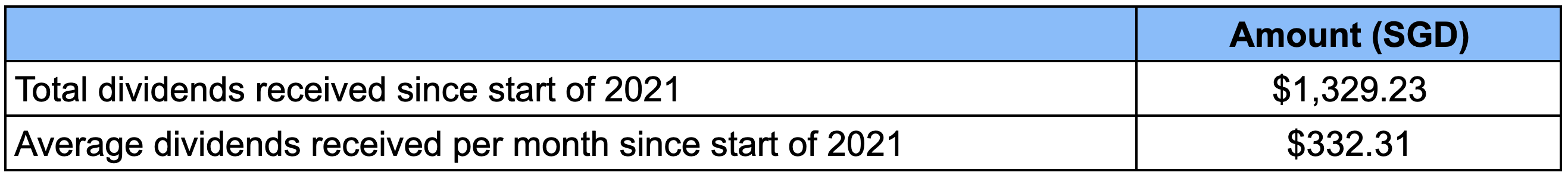 My total amount of dividends received since the start of 2021 thus still remain at S$1,329.23, giving me an average dividend amount of S$332.31 monthly from January till April 2021.