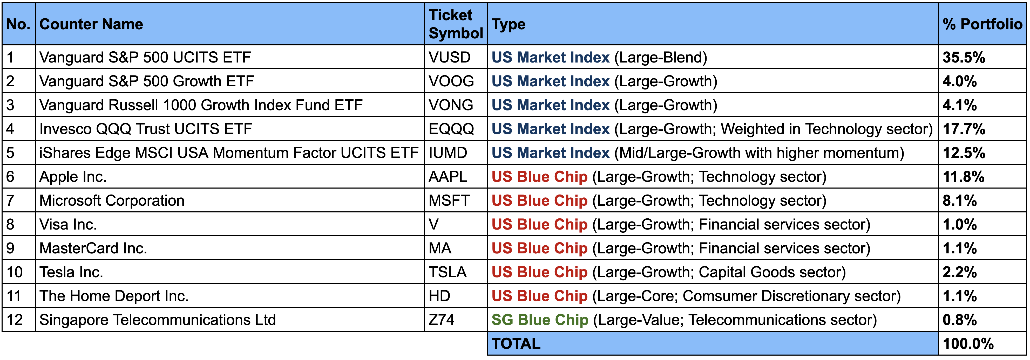 My portfolio listed here consists purely of equities only, and excludes social security (CPF & SRS), debt instrument holdings (i.e. bonds & SSBs etc), emergency funds, as well as personal savings.