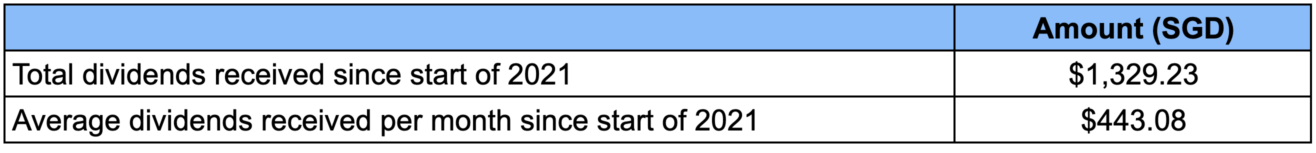 My total amount of dividends received since the start of 2021 thus now stands at S$1,329.23, giving me an average dividend amount of S$443.08 monthly from January till March 2021.
