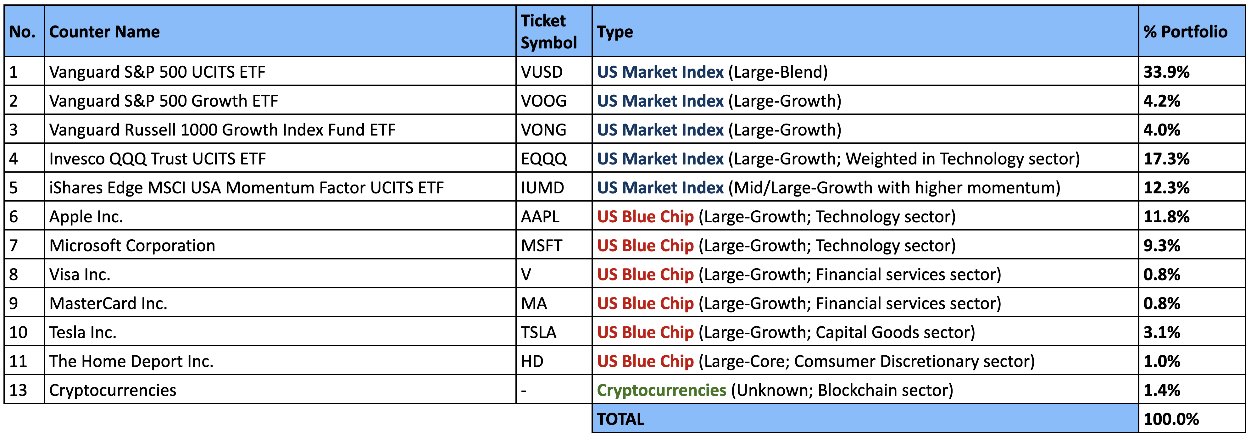 My portfolio listed here consists purely of equities and cryptocurrencies only, and excludes social security (CPF & SRS), debt instrument holdings (i.e. bonds & SSBs etc), emergency funds, as well as personal savings.