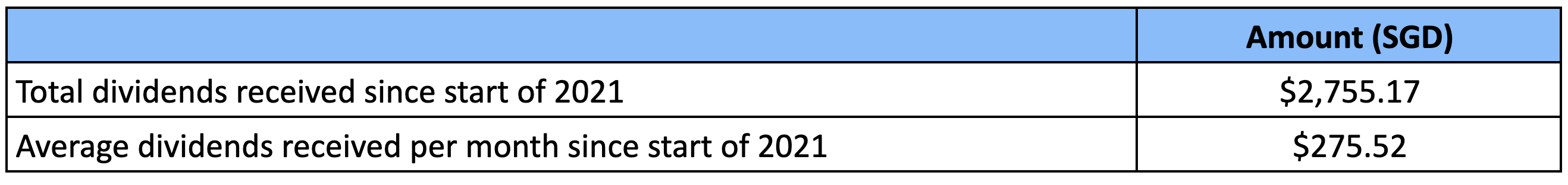 My total amount of dividends received since the start of 2021 thus still stand at S$2,755.17, giving me an average dividend amount of S$275.52 monthly from January till October 2021.