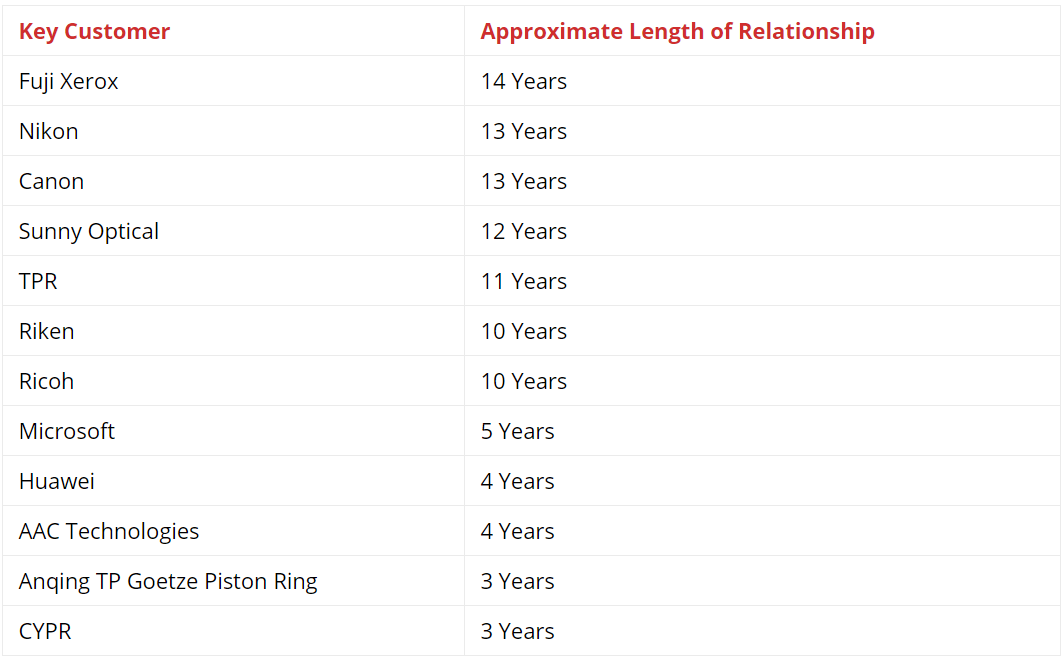 Our best guess is that Nanofilm’s largest customer would either be Apple, Xiaomi or Samsung Electronics. We were initially concerned that this largest customer could have been Huawei but since Huawei is already mentioned in their list of disclosed customers (see table below), we can safely exclude it.