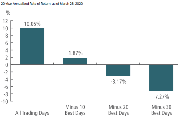 In the last 20 yrs (7300 days) if you miss the best 10 or 20 trading days this would be the difference in returns.