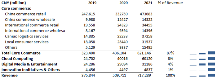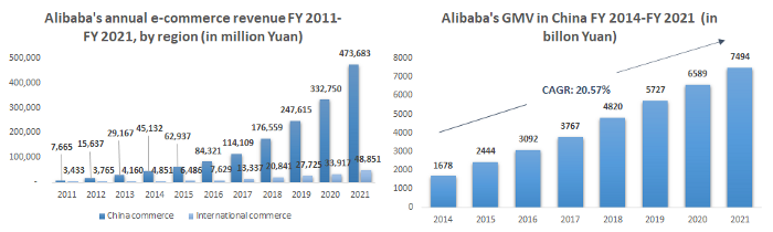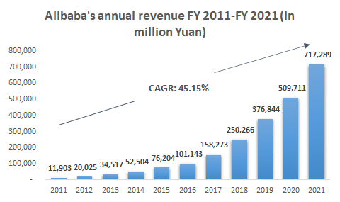 Alibaba’s main revenue source still comes from its e-commerce business, accounting for 87% of 2021 revenue. Alibaba gross merchandise volume (GMV) has seen a CAGR of 20.57% over the past 8 years. China’s overall e-commerce revenue is expected to grow at approximately 12% annually.