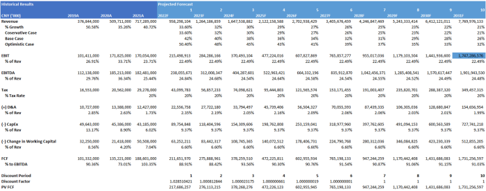 Despite the concerns mentioned above, I believe Alibaba is a company with strong fundamentals and an economic moat to deter competitors. They are currently trading at a lower multiple as compared to companies like Sea and Amazon due to concerns about the future of the company. Alibaba has displayed strong returns over the years and I believe it has not yet been reflected in its current share price. They are also operating in various growth industries such as E-commerce, Digital Finance and Cloud Computing. Lastly, I have used DCF for valuation and have derived a conservative estimated share price of $301.30 and a base case share price of $407.48 for 2030. In conclusion, Alibaba has huge upside potential and from a fair value standpoint and is currently trading at a discount.