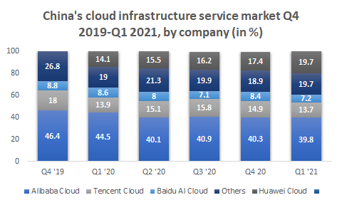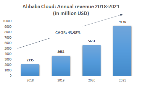 Alibaba Cloud business has seen a 43.98% CAGR since 2018. As of Q1 2021, Alibaba dominates/takes up approximately 39.8% of the China Cloud infrastructure service market. As the demand for cloud services increases, it is a matter of time for the Alibaba Cloud business segment to grow as well. As seen in research conducted by iResearch, the Cloud service market is expected to grow at 33% annually from 2015 to 2023.