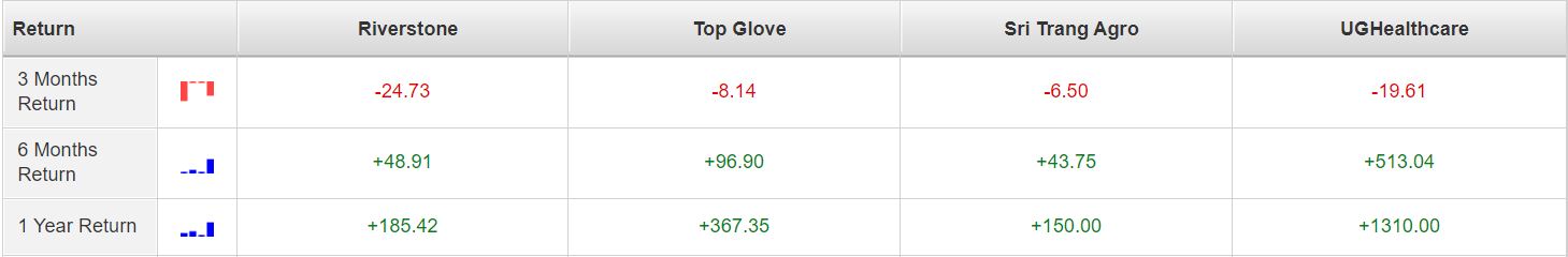 In terms of their performance, UG Healthcare has achieved a 1-Year Return of 1310% while Top Glove clocks in a return of more than 367% in the similar timeframe. On the other hand, Riverstone's return increased by 185% and Sri Trang Agro gained 150% on a 1-Year period.