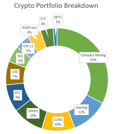 My crypto performance chart looked like it held up well in the face of altcoin obliteration but that was thanks to my CapEx into compass mining (more on that below), which I’ve valued at historical cost basis (paid about 7.7k USD/miner back in Jul/Aug 2021). That has become my main position as shown below: