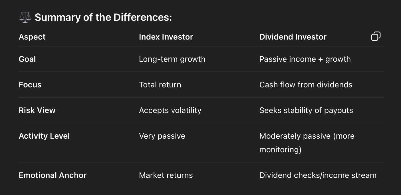- An index investors focused more on net worth growth, while a dividend investors are more income-focused, enjoying cahflow hitting the account.