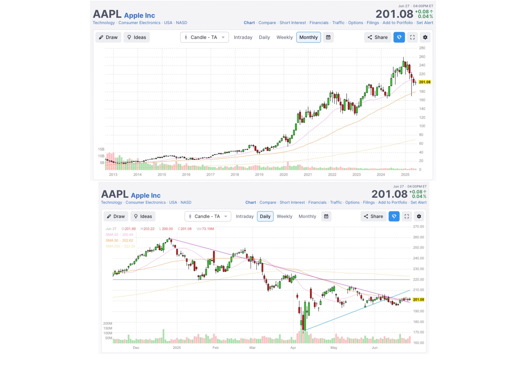 - While the general market and most of the Mag 7 are overextended, Apple stock is moving in consolidation. Looking to add some Apple in July.